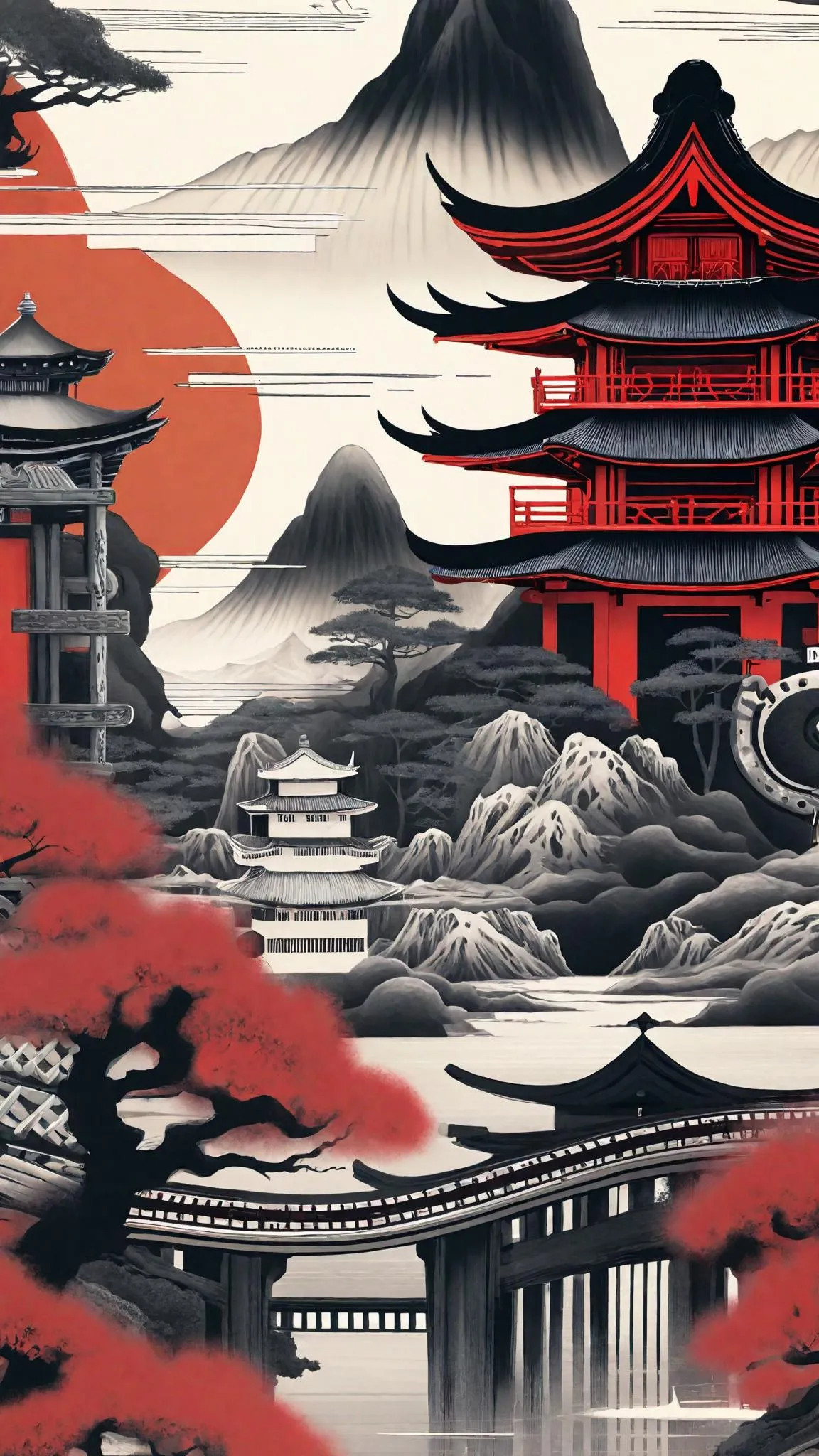 Psychedelic, vivid red, black, grays, and whites, intricate Japan ornate topography, featuring old scripts and detailed pictures of ancient Japanese swordsmiths, blending traditional art with surreal patterns.