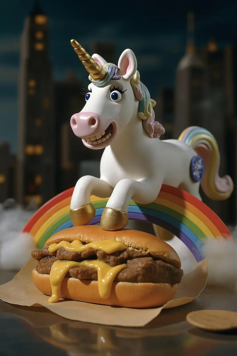 Create Aardman-style claymation magic with Vivago.ai's AI tools. Generate hyperreal stop-motion scenes featuring pearlescent unicorns devouring Philly cheesesteaks, complete with melted provolone strands, gelatinous rainbow refraction, and neon-lit ceramic textures. Perfect cinematic lighting captures steam details, marbled beef textures, and suspended bread fragments. Transform prompts into professional-grade animated masterpieces with realistic clay fingerprints and atmospheric resin effects.