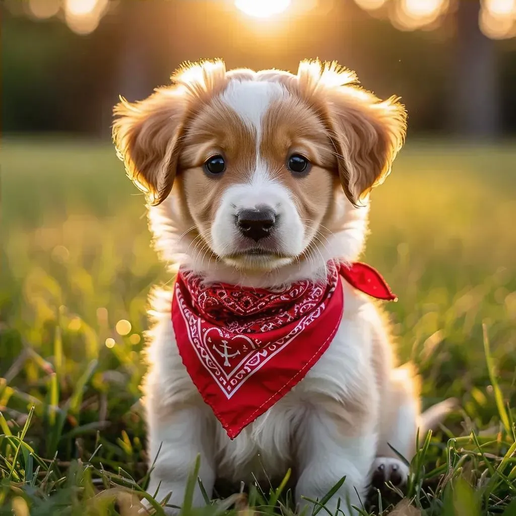 Capture the charm of an adorable white puppy in a red nautical bandana with soft fur and curious eyes. High-quality pet portrait in sunny outdoor setting, green grass backdrop, golden hour lighting, shallow depth of field, detailed textures. Professional 4K resolution photography using Canon EOS R5, 85mm f/1.2 lens for crisp, lifelike cute animal imagery.