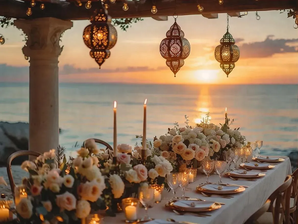 Capture the magic of an elegant outdoor sunset dinner with ornate lanterns, floral arrangements, and golden hour lighting. AI-generated visuals bring romantic beach settings, luxurious decor, and intimate gatherings to life. Create dreamy, vintage-inspired seaside celebrations using soft focus photography and professional editing tools.