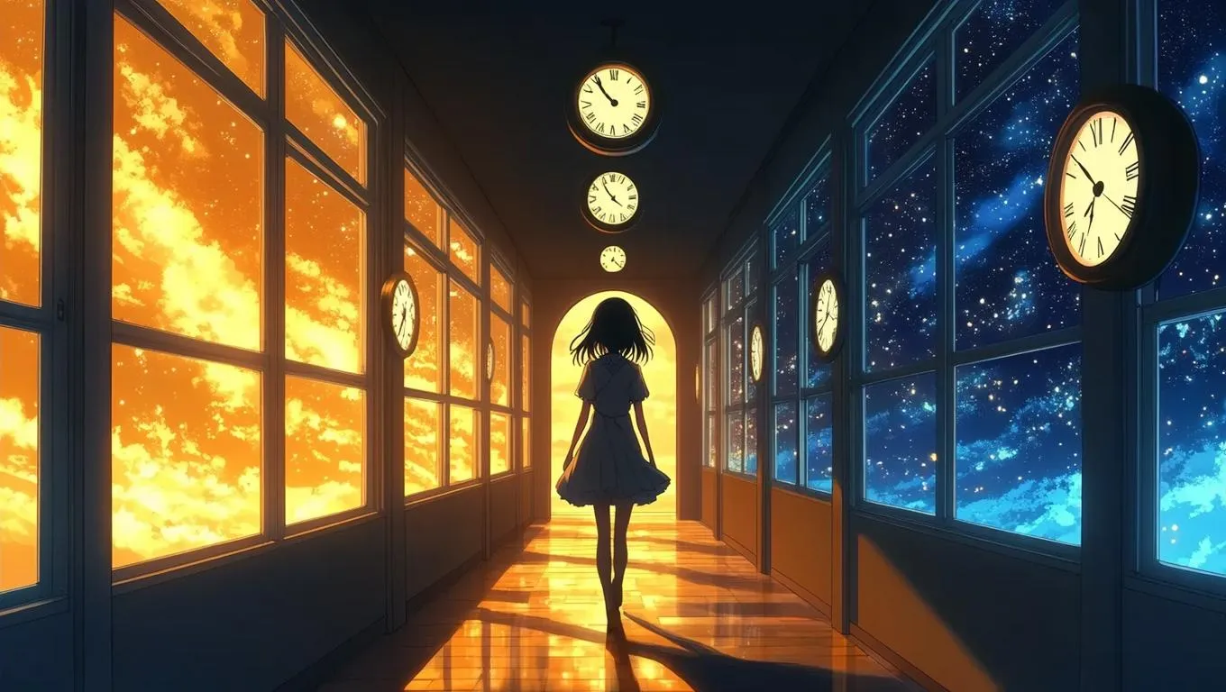 Transform text into surreal anime scenes with Vivago.ai's AI image generator. Craft cinematic visuals of a girl traversing a day-night hallway, walls lined with erratic clocks, her hair shifting hues. Achieve watercolor gradients, mirrored shadows, and precise surreal detail—ideal for creating liminal, otherworldly moments through AI-powered artistry.