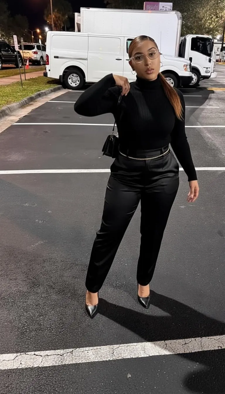 Transform office attire into high fashion. Generate AI images of chic professional looks featuring a tight black turtleneck, thin gold accent belt, sleek satin trousers, and elegant heels. Create polished, modern workwear visuals with our AI art tools. Perfect for fashion design inspiration or branding content.