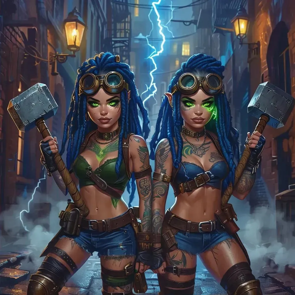 Vivid steampunk fantasy scene featuring twin dwarf warrior sisters with glowing tattoos, lightning-charged steam hammers, and dreadlocked hair. Gaslit alley ambiance blends mystical ink painting aesthetics with industrial machinery hum, cinematic magic realism, and adventure-ready atmosphere. AI-powered tools transform this mystic fantasy prompt into striking ink-style visuals merging technology and battle-ready steampunk grandeur.