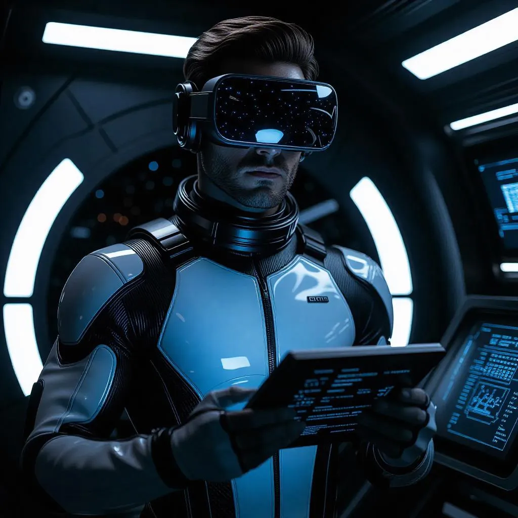 Generate a futuristic astronaut portrait with AI precision. This high-resolution image features a confident, athletic man in a sleek spacesuit and advanced headset, holding a holographic device aboard a spaceship. Detailed sci-fi elements like starry portholes and high-tech equipment enhance the scientific atmosphere. Create professional space-themed visuals effortlessly with Vivago.ai's text-to-image AI tools and curated effects.