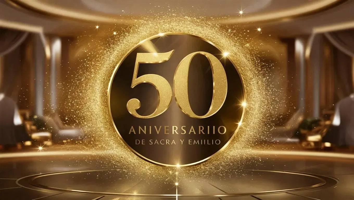 Create a premium 50th anniversary logo with AI. Vivago.ai generates golden "Sacra y Emilio" text on a soft particle background, blending AI effects and elegant typography for memorable celebration branding. Customize professional designs effortlessly.