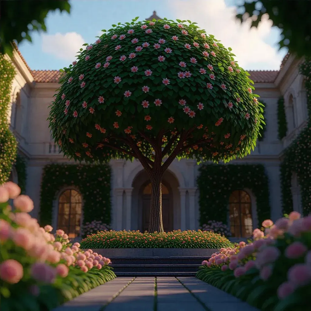 Vivid HD 3D scene of a grand vine-covered building with blooming flowers, paired with a lush summer tree in vibrant colors. Soft natural lighting highlights realistic textures, intricate details, and balanced composition. Explore AI-generated elegance with vivago.ai's advanced tools for lifelike image creation, enhancing natural art styles for professional-grade visual storytelling.