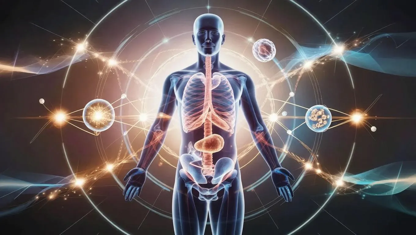 Explore biological complexity with this AI-generated image of a translucent human body revealing cells, molecules, and glowing subatomic particles. Set against an abstract energy field with geometric shapes, it blends realistic scientific detail and Dune-inspired artistry. Perfect for visualizing molecular structures, cellular connections, and quantum forces in a striking, vibrant gradient.