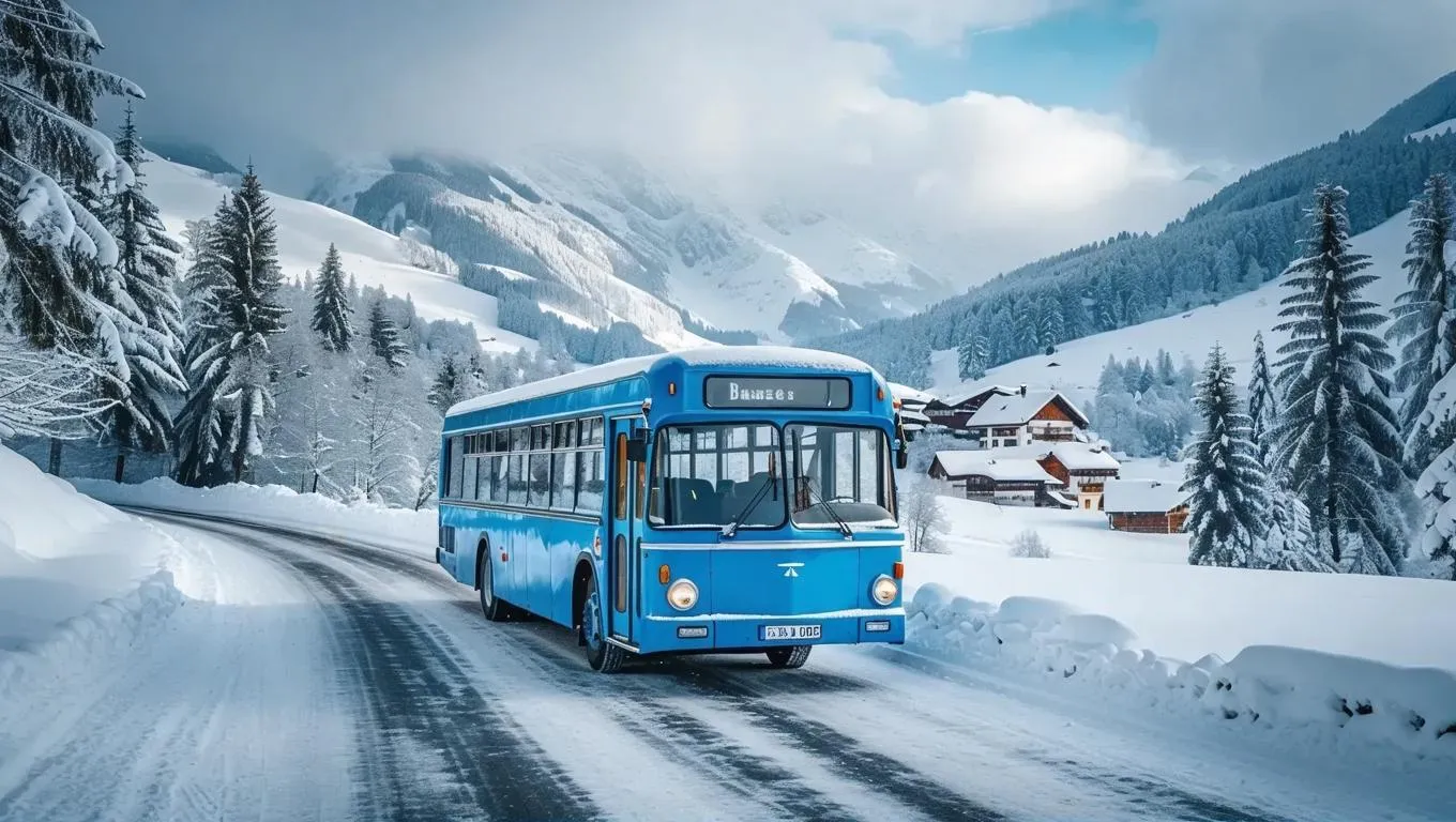 Generate a vivid winter scene of a blue bus traveling through snow-covered hills with vivago.ai's AI image tools. Create stunning snowy landscapes, realistic frosty atmospheres, and dynamic vehicle motion for immersive winter storytelling. Perfect for travel blogs, seasonal promotions, and cold-weather visual projects.