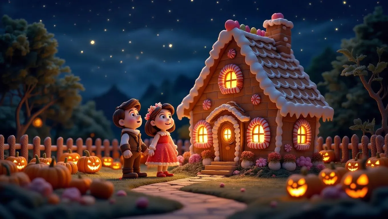 In a clay animation, at night under a starry sky, Hansel and Gretel are standing by a fantastic house made of gingerbread, the bricks of candy, the beams of candy canes. The way to the hut made of lollipops and the fence made of candies.full of colorful pumpkins and halloween decorations, glitter falls like the dawn sky, adding sprinkles of stardust glitter from above. Halloween atmosphere, magical and whimsical.