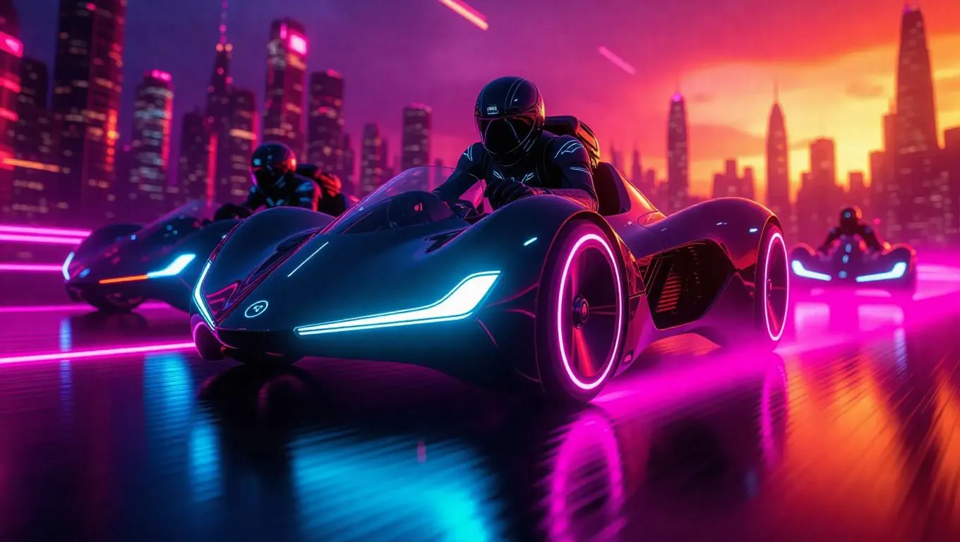 Blurange Jetpack Racing Team, futuristic racers soaring through neon-lit skies, high-speed aerodynamic suits, dynamic motion blur, intense competition, cityscape backdrop, glowing trails, advanced technology, sleek design, adrenaline rush.