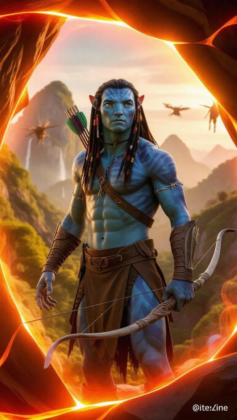 Jack Sully, dressed as a Na'vi with gleaming tattoos, stands in front of a dimensional rift, holding a bow and arrow, eyes full of awe. Strange fluids and light of Pandora flow through the rift, with creatures and beauty emerging around him. Floating mountains and dense forests mingle with the light in the cracks, painted in thick CG style, ultra-high definition by Octane. Colorful, full of fantasy, and surreal. Resolution 16K, RGB color mode. Na'vi skin texture, cloth and biomaterial costume, flowing, glowing Pandora elements. Illumination by crack light and natural Pandora light. Jack Sully centered, rift opening behind him. Avoid dull colors, lack of fantasy, low resolution, unclear picture, and non-surrealist elements.