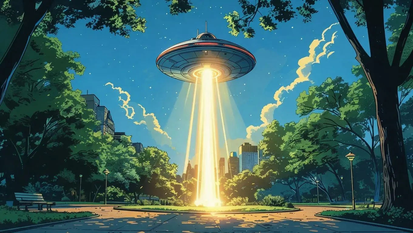Transform text into vibrant AI-generated comic art. Create a sci-fi scene with a bright beam shooting from a spaceship into a nearby park, blending dynamic comic-style visuals and professional AI effects for striking, imaginative storytelling. Perfect for eye-catching digital art and creative projects.