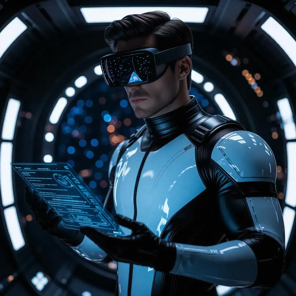 Generate a futuristic astronaut portrait with AI precision. This high-resolution image features a confident, athletic man in a sleek spacesuit and advanced headset, holding a holographic device aboard a spaceship. Detailed sci-fi elements like starry portholes and high-tech equipment enhance the scientific atmosphere. Create professional space-themed visuals effortlessly with Vivago.ai's text-to-image AI tools and curated effects.