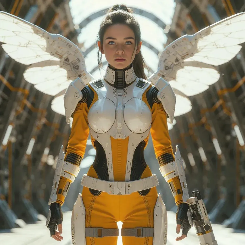 AI-generated sci-fi warrior in dynamic pose featuring mustard-yellow futuristic armor, textured wing-like cape, and cybernetic helmet. Create striking sci-fi character designs with metallic accents, high-tech accessories, and cinematic lighting using AI-powered tools for professional-grade concept art or fantasy visuals. Ideal for futuristic storytelling, cosplay inspiration, or digital world-building projects.