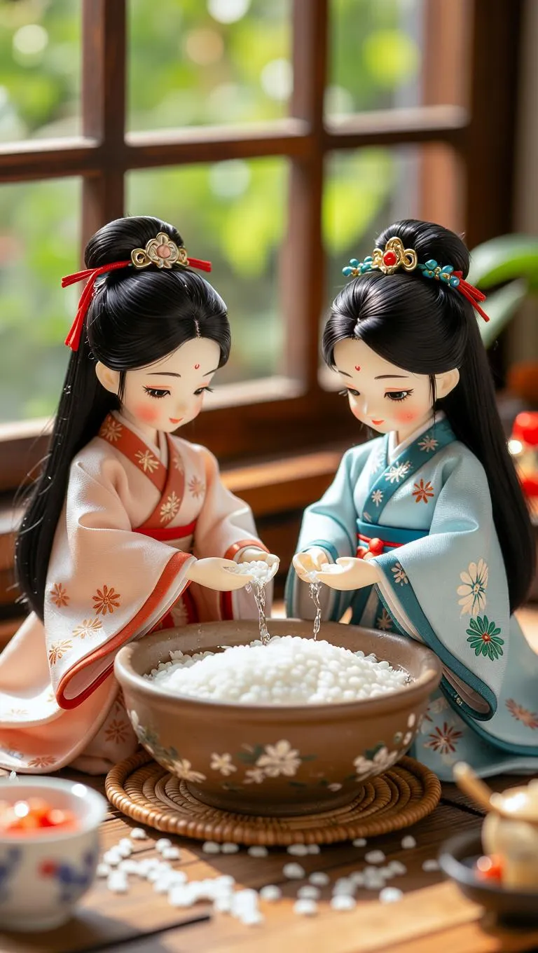 微缩场景,两位身穿汉服的可爱玩偶小人正在中式陶盆中清洗糯米,端午节氛围,自然光,微距摄影,精致细节,柔和色调。