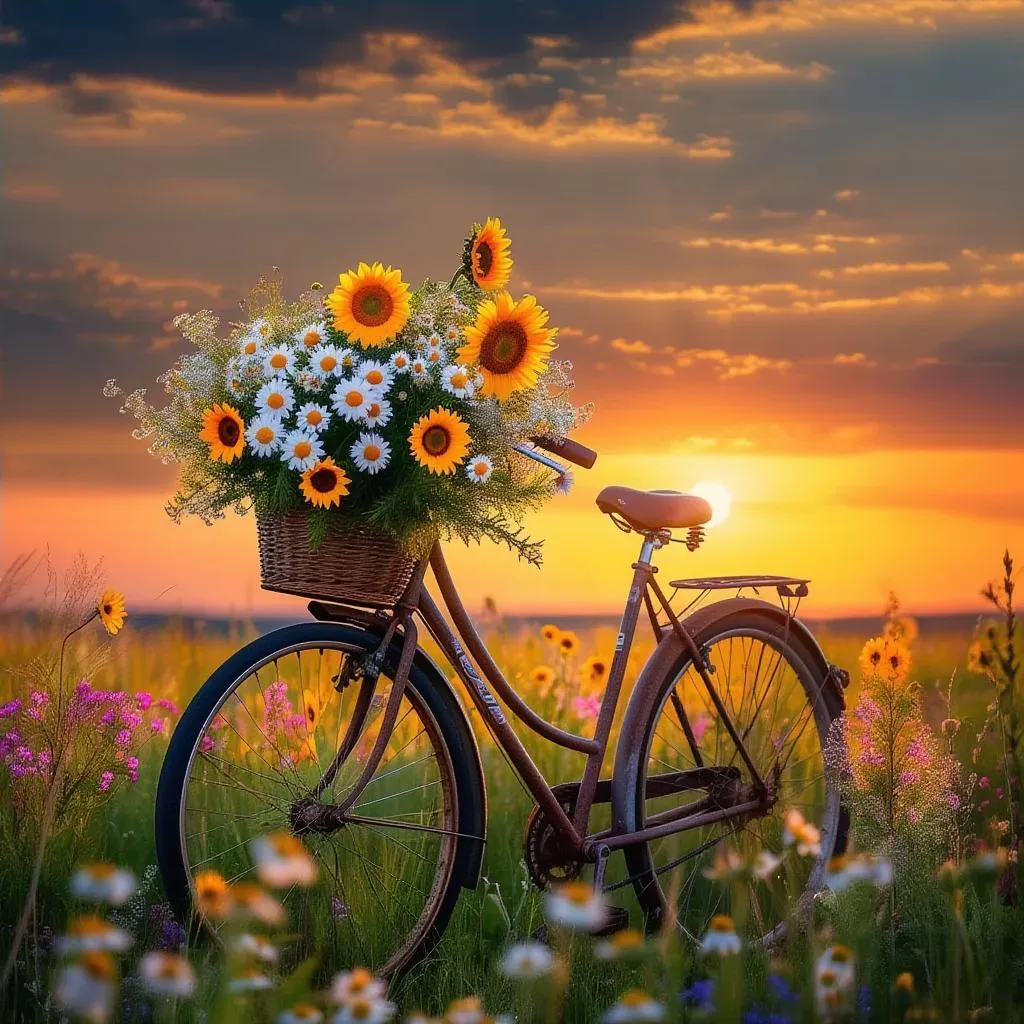 Create a vibrant AI-generated image of a serene field bursting with colorful wildflowers, featuring a vintage bicycle at its heart. The basket overflows with daisies and sunflowers, framed by a golden sunset sky. Perfect for nature-inspired visuals, crafted effortlessly with Vivago.ai's advanced text-to-image tools for professional, picturesque results.