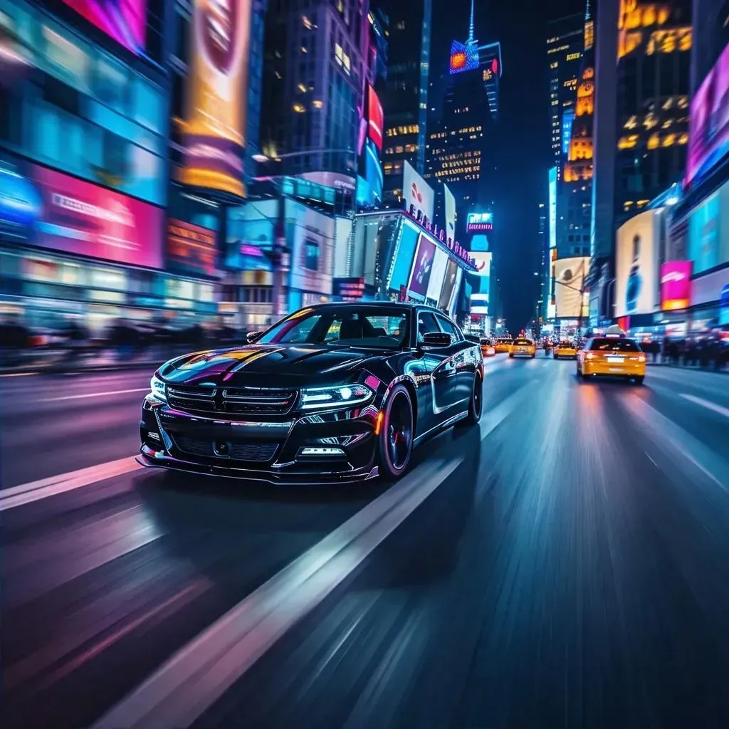 Create a thrilling AI-generated video of a sleek black car racing through a neon-lit cityscape at breakneck speed. Experience dynamic high-speed chase visuals with cinematic camera shakes, motion blur effects, and vibrant light trails. Perfect for action-packed scenes and adrenaline-pumping AI video generation.
