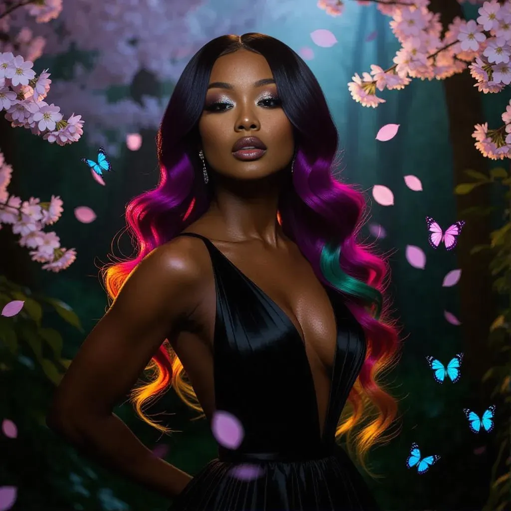 Vivago.ai crafts AI-generated visuals of a confident black woman with vibrant rainbow hair, glowing in a twilight forest. Create ethereal scenes with bioluminescent flora, cherry blossoms, and luminescent butterflies. Transform prompts into dynamic art featuring sleek attire, prismatic lighting, and dreamy pastel skies for professional-grade, imaginative storytelling.