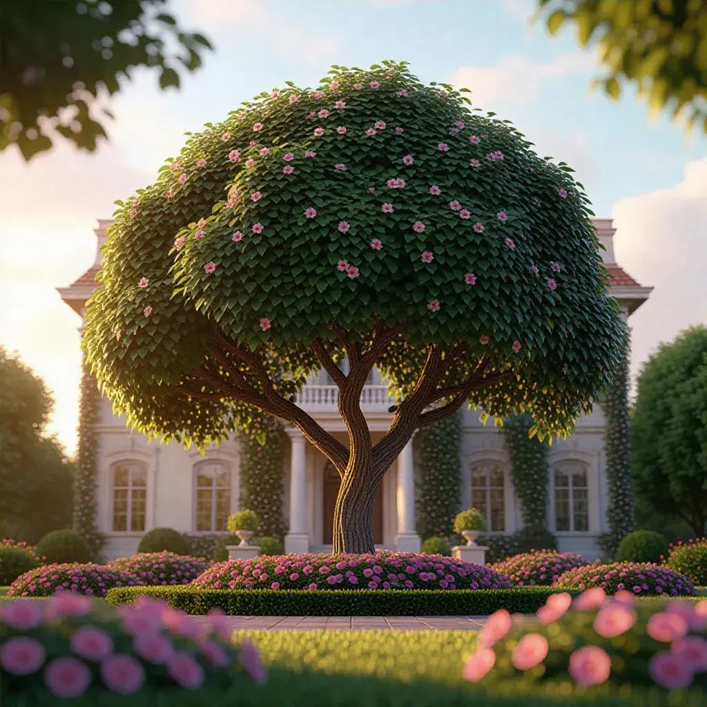 Vivid HD 3D scene of a grand vine-covered building with blooming flowers, paired with a lush summer tree in vibrant colors. Soft natural lighting highlights realistic textures, intricate details, and balanced composition. Explore AI-generated elegance with vivago.ai's advanced tools for lifelike image creation, enhancing natural art styles for professional-grade visual storytelling.