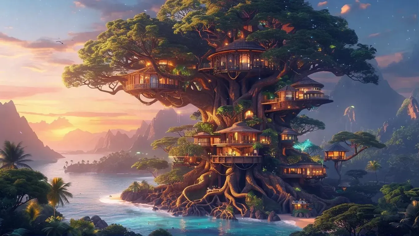Create an AI-generated magical world with Vivago.ai: Envision towering trees housing spacious homes in sun-drenched mountains near coastal waters. Craft lush, tropical fantasy landscapes, mystical tree dwellings, and vibrant ecosystems effortlessly using AI tools for professional-grade visuals. Transform prompts into enchanting realms where nature and imagination merge seamlessly.