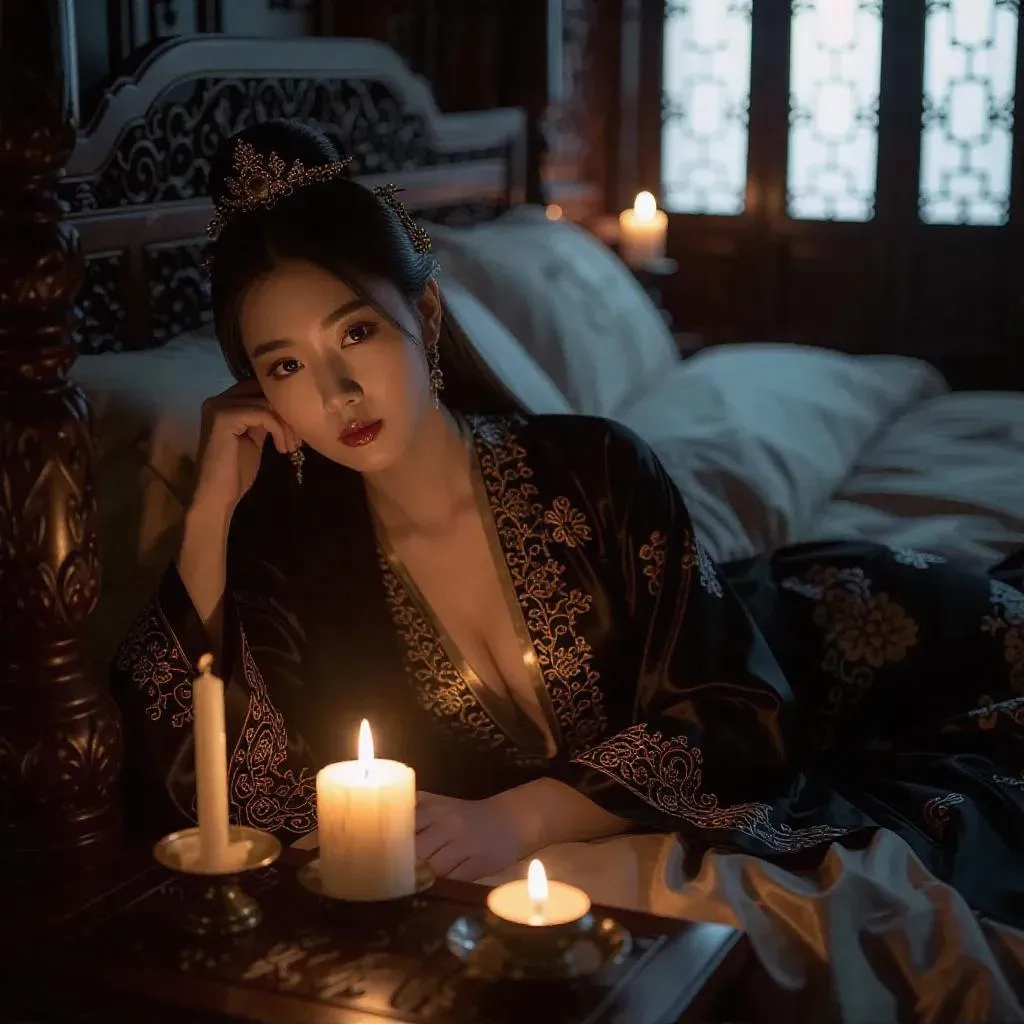 Immerse in a Ming dynasty-inspired AI-generated scene: a young mandarin princess in silky décolletage gown lounges elegantly on a lavish bed, surrounded by spring florals. Soft candlelight and incense fragrance enhance the serene, intimate atmosphere. Crafted with vivago.ai's AI image tools for historical beauty and seasonal ambiance.