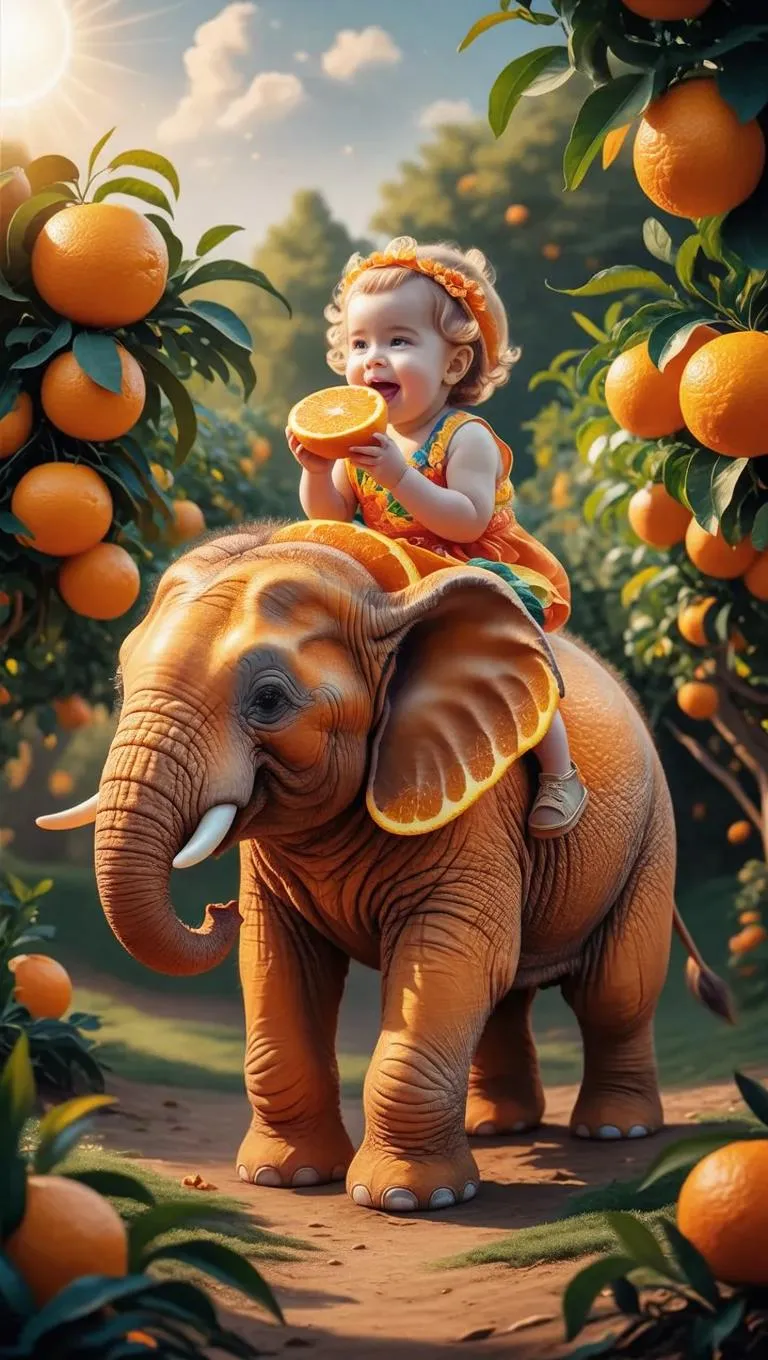 Surreal AI-generated image of an orange-textured elephant with vibrant citrus segments wandering a lush grove. A joyful toddler in colorful attire savors a juicy orange slice atop its back. Combines hyper-realistic details, whimsical nature scenes, and childhood wonder. Transform ideas into magical visuals with vivago.ai's AI effects for professional, vibrant creative content.