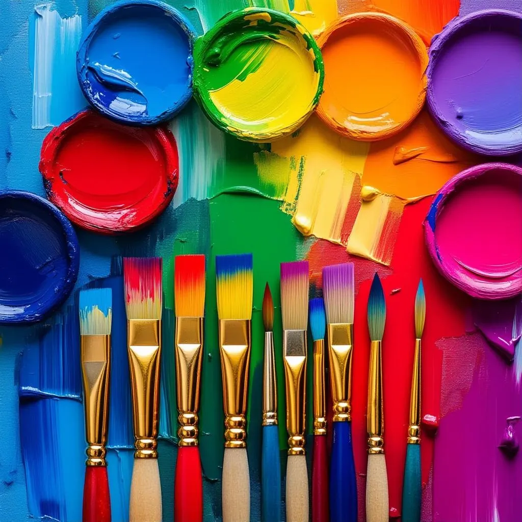 Vibrant AI-generated artist palettes with vivid oil paints, colorful smears, and textured surfaces. Explore macro photography of artistic tools, golden ferrules, and creative still life compositions. High-detail AI effects, soft lighting, and shallow depth bring inspiration to life through vivago.ai's professional image generation.