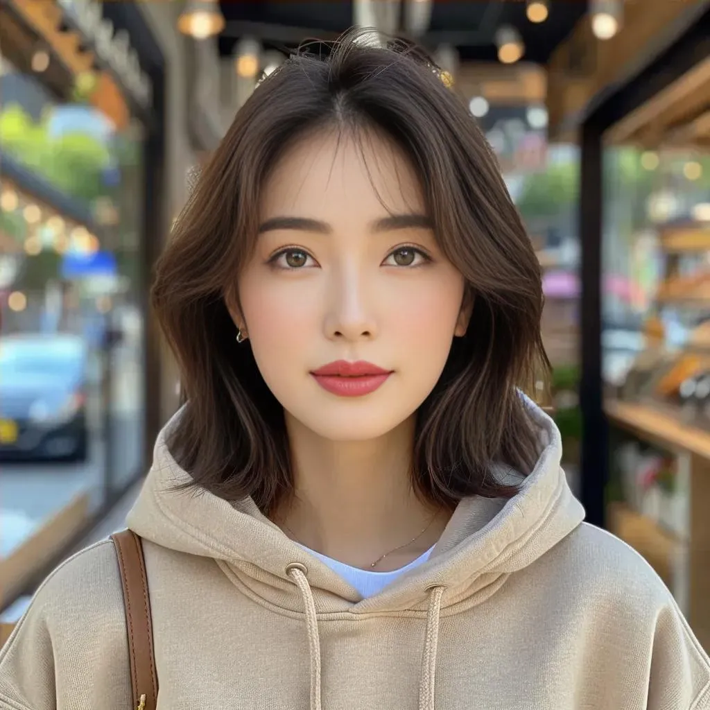 Create stunning AI-generated visuals of a fair-skinned Asian woman with pink blushed cheeks, green eyes, and medium hair. Highlight her slim, fit physique in casual outfits—hoodie, sneakers, T-shirt. Perfect for professional-grade results with vivago.ai's AI effects and editing tools.