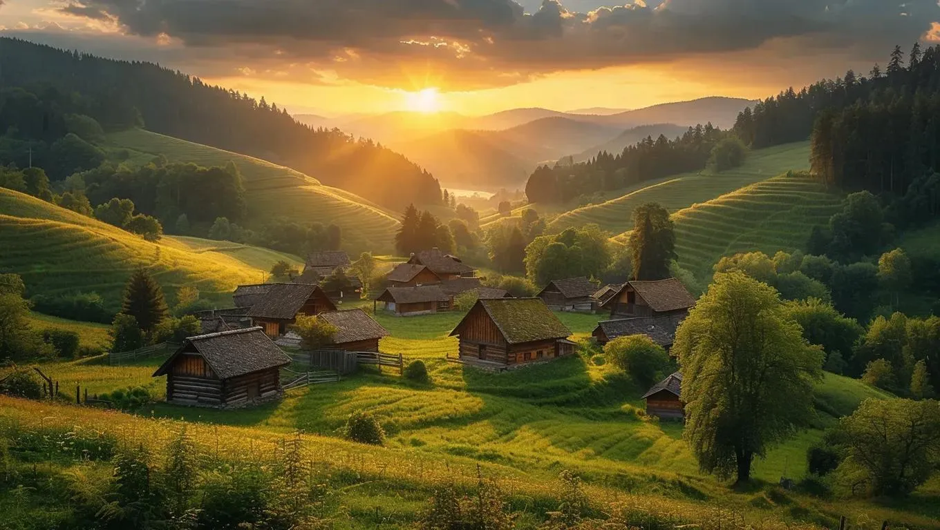 Create a stunning AI-generated dusk scene: a humble village nestled in rolling hills, framed by a dark forest edge under golden-hour skies. Perfect for storytelling, mood boards, or digital art. Elevate your visuals with Vivago.ai's professional AI tools for immersive landscapes and atmospheric effects.