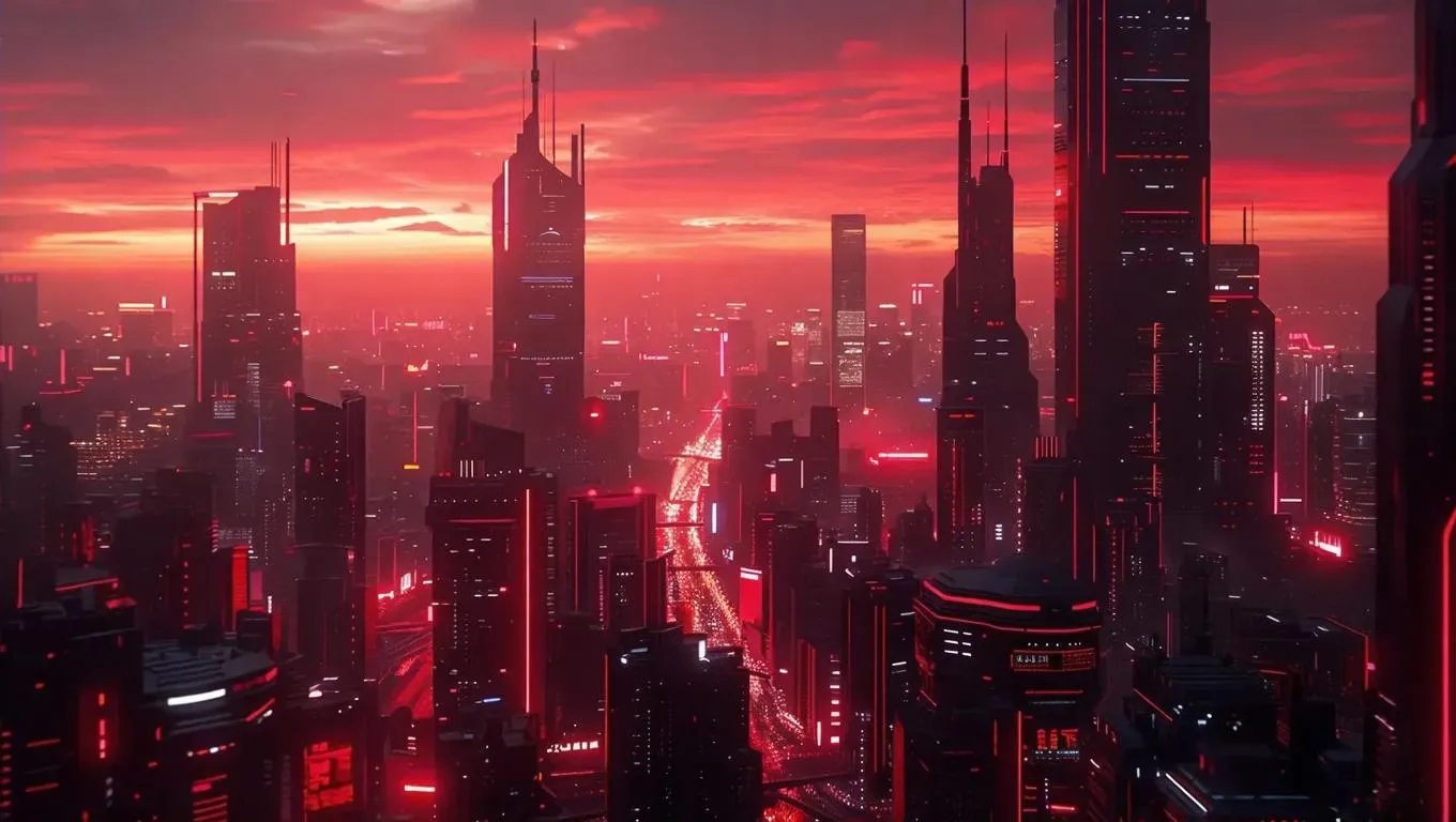 Generate a dystopian 3D future cityscape inspired by Blade Runner 2049, featuring towering red-and-black architecture captured from a high aerial vantage point. Enhanced with neon cold lighting, cinematic twilight tones, and cyberpunk graphite-black accents for a hyper-realistic, immersive cyber-metropolis. AI-powered tools ensure ultra-HD quality with neoncity vibes and muted cinematic depth.