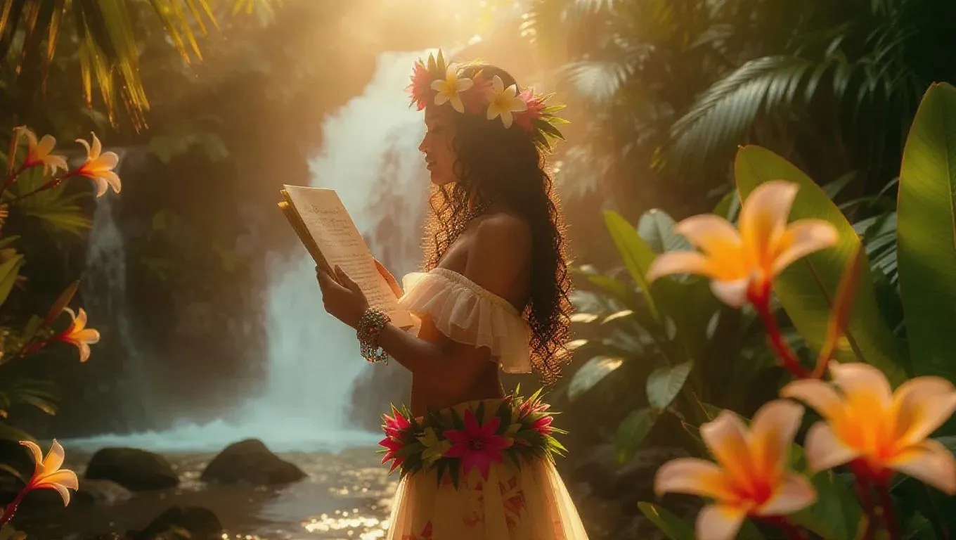 Generate a stunning AI-generated Tahitian fairy holding a sacred Tupuna ancestral scroll in a lush Tahiti valley. Create high-quality fantasy art with Vivago.ai's professional AI image tools for magical Polynesian-inspired character designs and tropical landscape visuals.