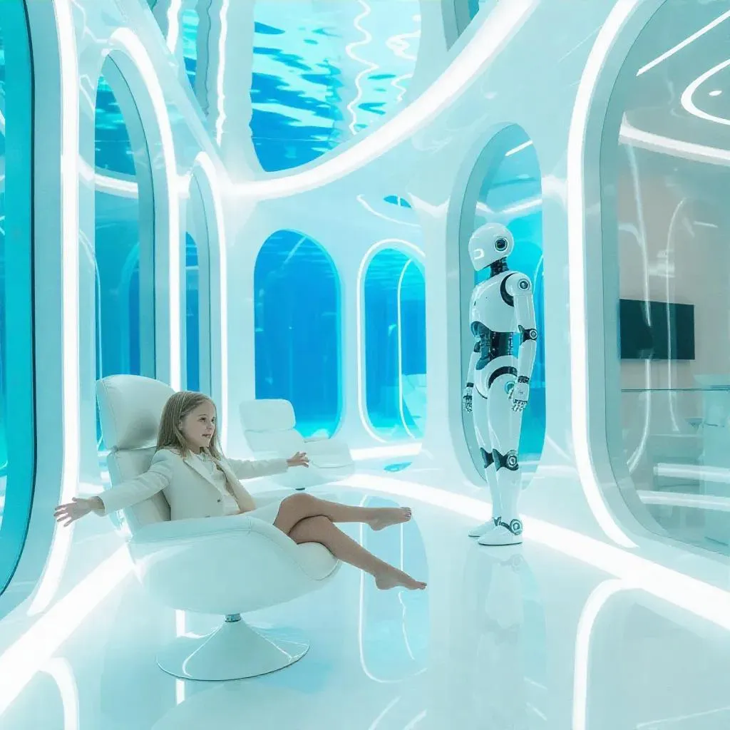 Create AI-generated futuristic underwater scenes with transparent glass walls and minimalist decor. Visualize blonde children in business attire interacting with multi-tiered AI robot servants through Vivago.ai's advanced image generation. Perfect for conceptualizing curved architecture, modern office chairs, and immersive aquatic environments in crisp white/cream tones.