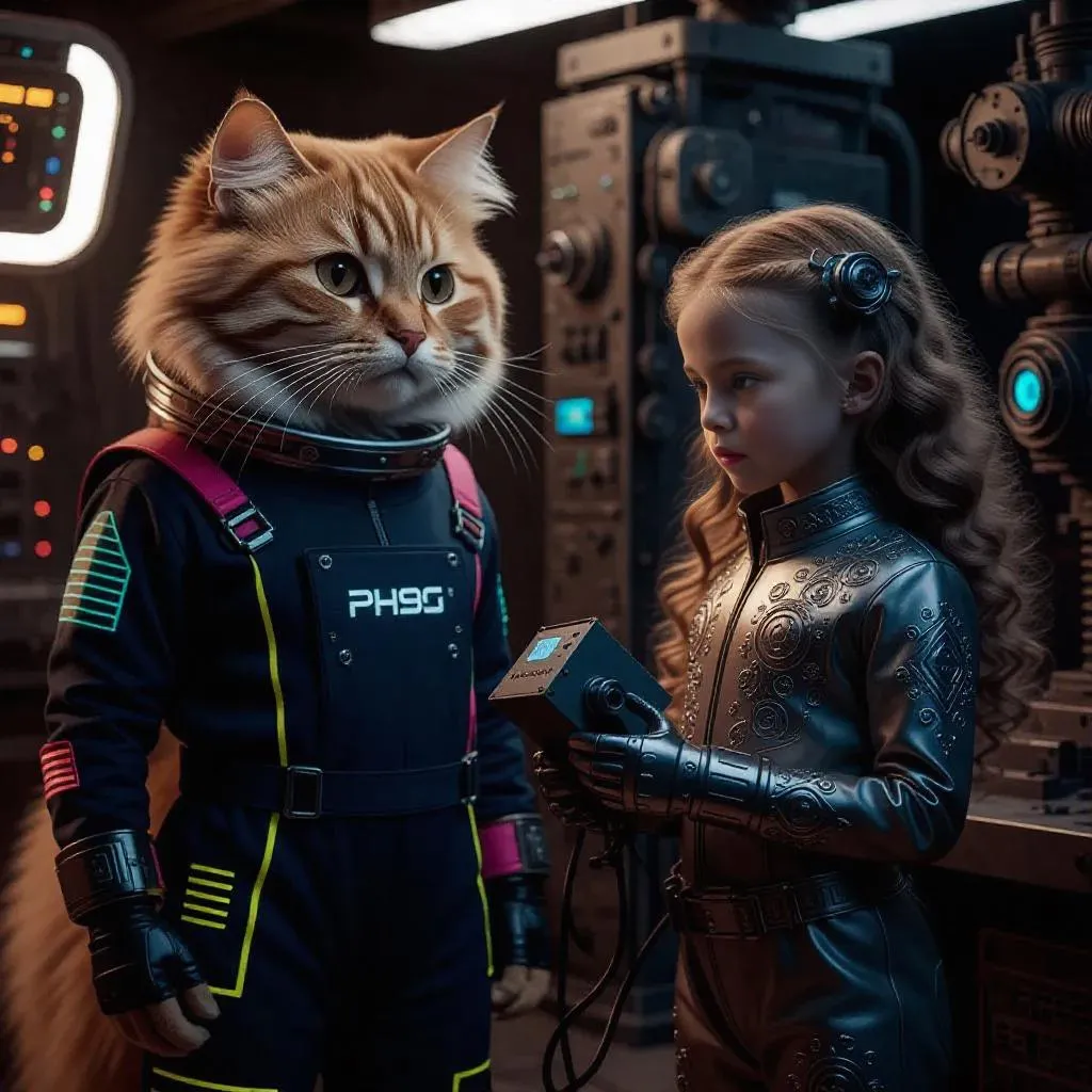 AI-generated cyberpunk art featuring an anthropomorphic ginger cat in a neon-glowing space-age jumpsuit and a futuristic girl welding a robot. High-resolution visuals blend intricate patterns, glowing accents, retro-futuristic tech, and vivid sci-fi storytelling. Perfect for AI image generation enthusiasts seeking imaginative, detailed characters in a dynamic, neon-lit industrial setting.