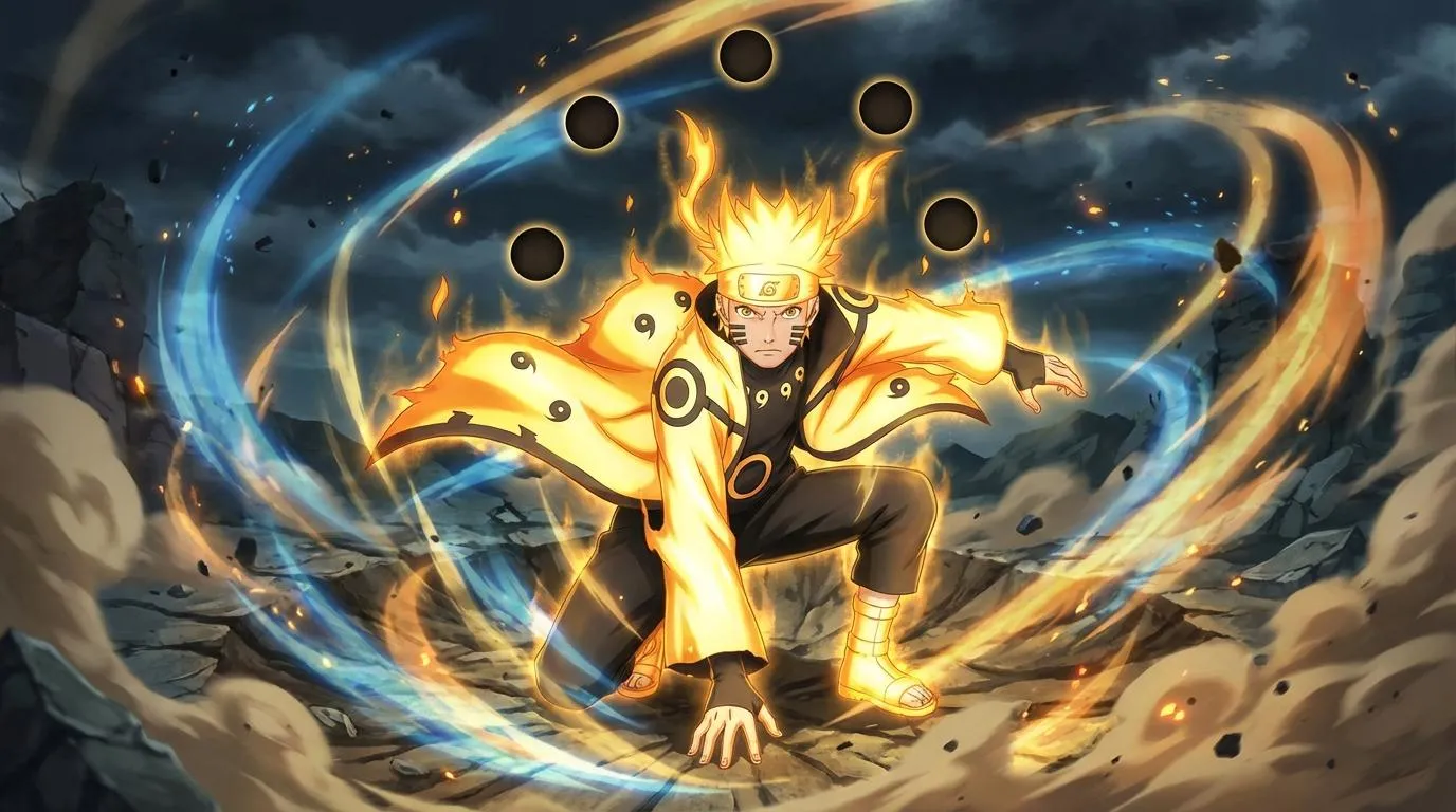 "Naruto Uzumaki in Sage of Six Paths mode, glowing with golden chakra, Truth-Seeking Orbs floating behind him, wearing his iconic cloak with black patterns, dynamic anime style, intense battle-ready pose, flowing hair, dramatic lighting, epic background with swirling energy, highly detailed, cinematic, vibrant colors, ultra-detailed 4K anime illustration"