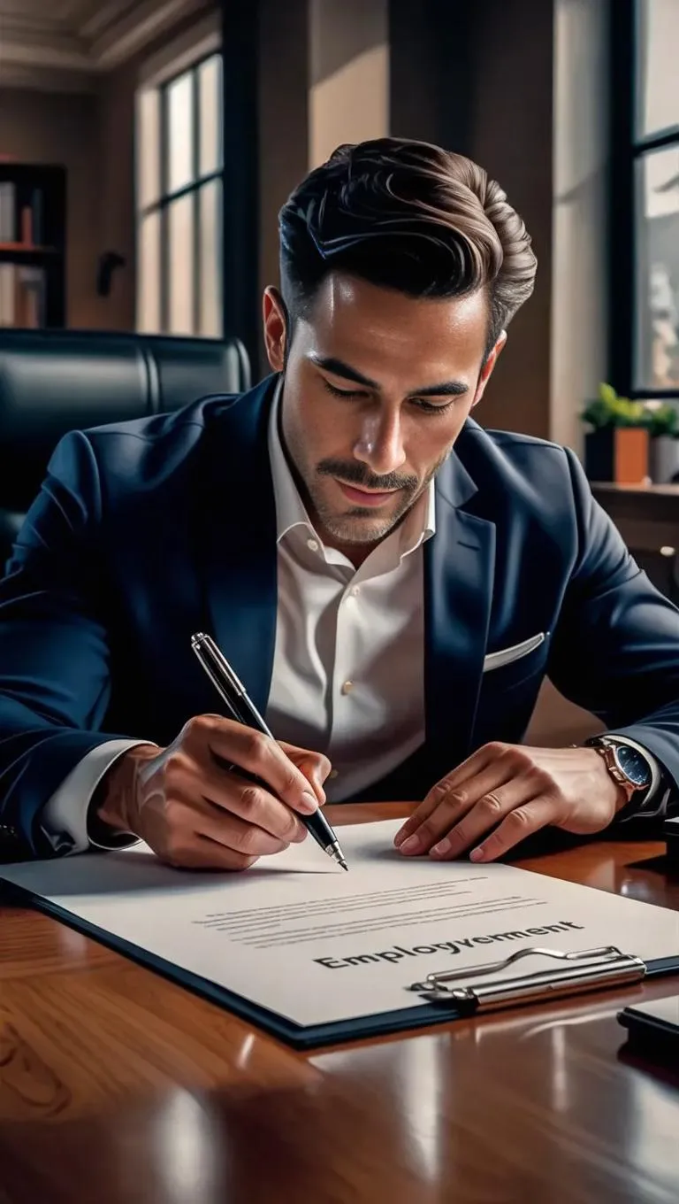 Craft professional Employment Agreements with AI-generated imagery. Realistic portrait of a man drafting contracts using white paper and black pen. Ideal for HR, legal professionals, and businesses seeking authentic, detailed contract visualization tools. Enhance document creation with AI precision.