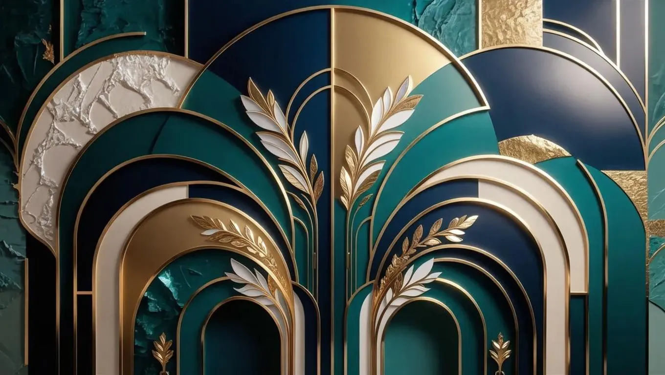 Explore Art Deco-inspired digital artwork with abstract geometric patterns. Featuring overlapping arches, semi-circles, and stylized leaf motifs in teal, navy, gold, and cream. Metallic sheen accents blend with textured blue-green backgrounds for layered depth. Ideal for modern design projects seeking bold color palettes, intricate detailing, and a fusion of natural elements within a structured, vintage-modern aesthetic.
