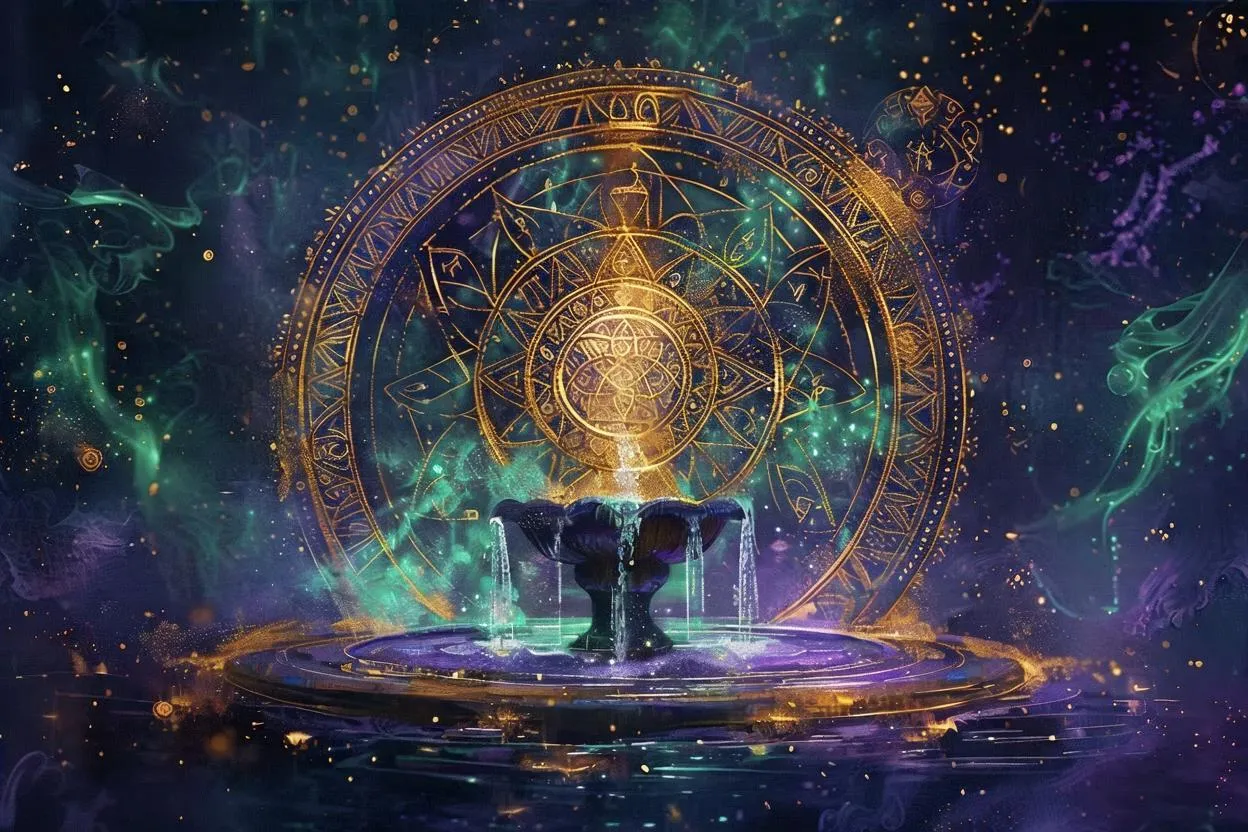 Generate a mystical dark background with deep blue and purple hues, centered by a golden aura radiating spiritual energy. AI-powered tools add glowing magic circles, esoteric symbols, and ethereal green-white sparks for a transcendent vibe. Ideal for mystical art, spirituality themes, or enchanting digital creations.