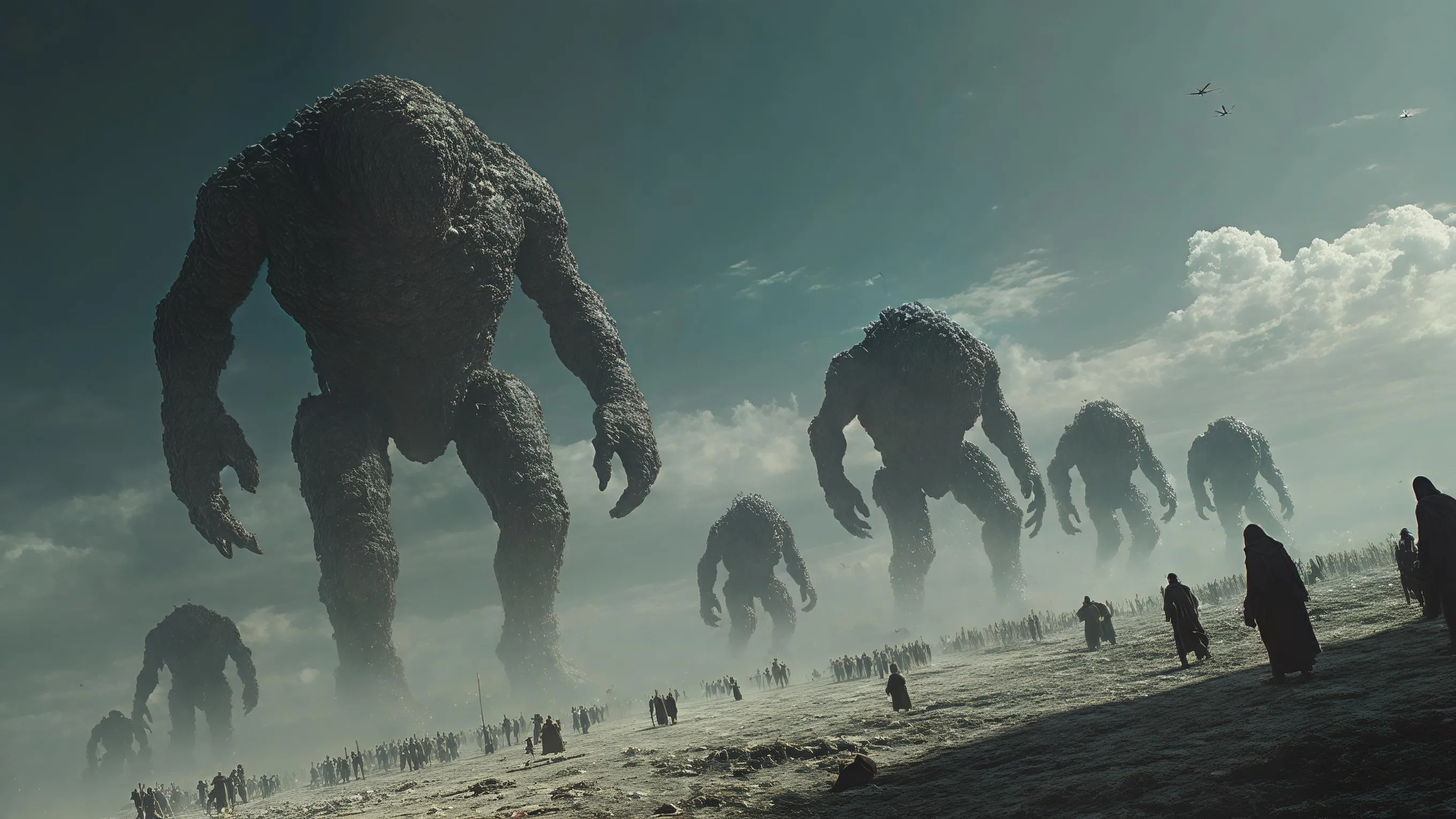 Create AI-generated cinematic visuals of god-like giants dominating Earth. Epic dark atmosphere, 16:9 scale, cities under shadow, humans scattering before colossal power. Transform text to stunning images with VivaGo.ai.