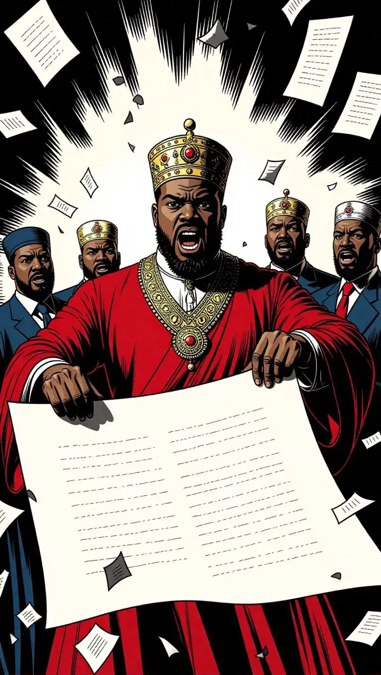 Vivago.ai crafts AI-generated cartoon scenes like Menelik II tearing a treaty scroll with fiery intensity, surrounded by stunned advisors and swirling papers. Elevate storytelling with dynamic visuals, blending historical drama and AI artistry for striking, shareable content.