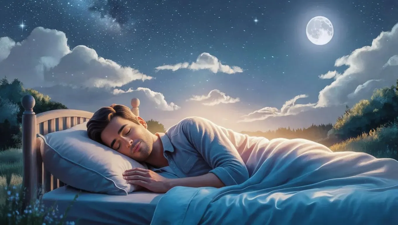 Generate a realistic AI image of a tranquil nighttime scene with a man sleeping under a starry sky. This serene, open-air setting combines soft moonlight, twinkling stars, and dreamlike ambiance to promote relaxation and restful sleep. Perfect for calming visuals, blending natural beauty with soothing celestial elements for ultimate peace.