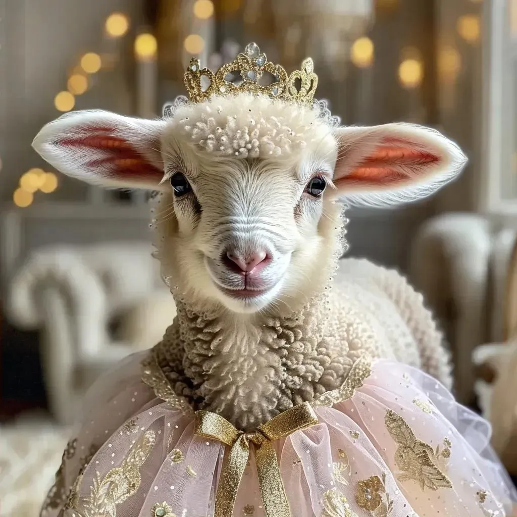 Discover AI-generated realism with this adorable lamb in a princess outfit, set in a cozy playroom. Warm lamplight and natural sunlight highlight the lamb's expressive eyes, creating a lifelike, enchanting scene. Perfect for creative projects seeking detailed, cute animal imagery.