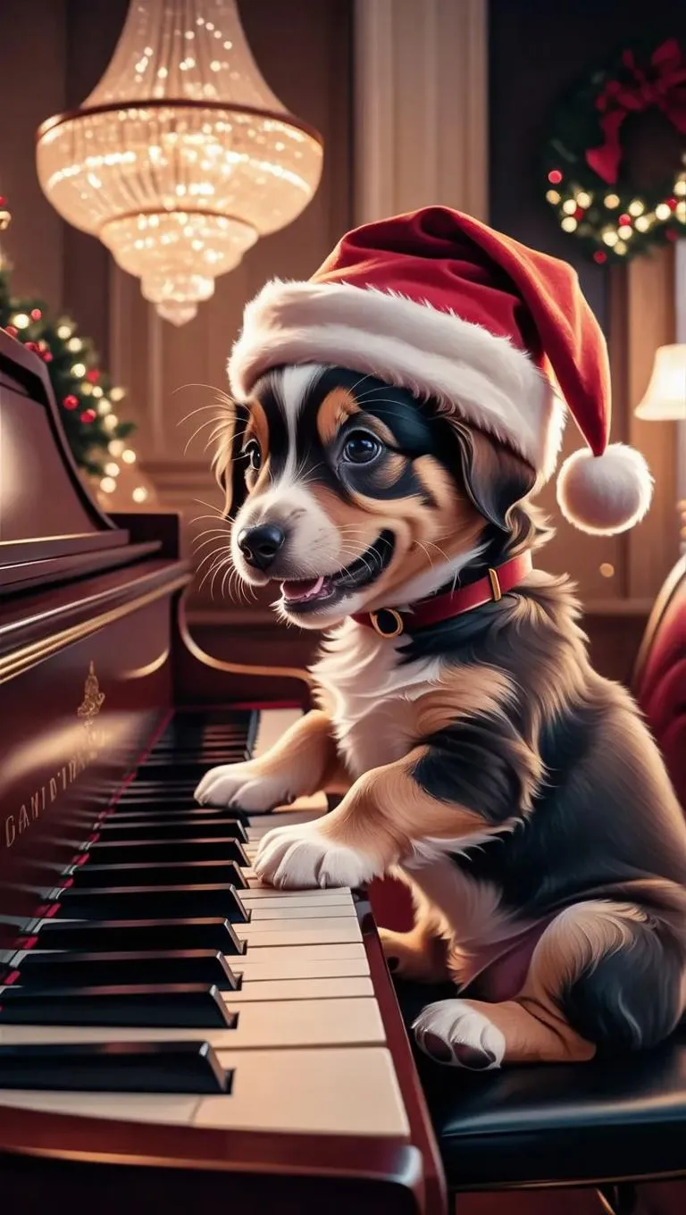 Generate a lifelike AI image of a cheerful puppy wearing a Santa hat, playing piano from a side view. Ideal for festive content, blending realistic details, holiday charm, and professional AI effects for Christmas cards, social posts, or heartwarming winter-themed visuals.