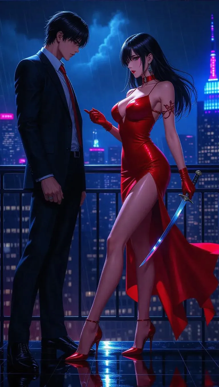 anime rooftop duel in storm, femme fatale in red heels and soaked black dress holding blade, spy facing her shirt ripped, rain glinting off his silver ring