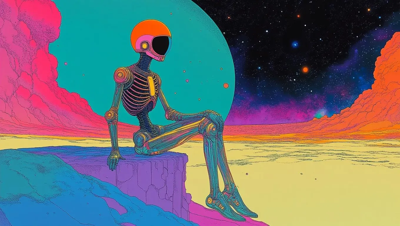 Create cosmic surrealism with AI: blend Moebius' intricate lines, Satoshi Kon's dynamism, and Peter Max's vibrant hues. Generate ethereal skeletons in interstellar realms, glowing with surreal auras. Vivago.ai crafts dreamlike visuals through AI-powered effects—vibrant colors, intricate details, and celestial backdrops for professional-grade, otherworldly art.