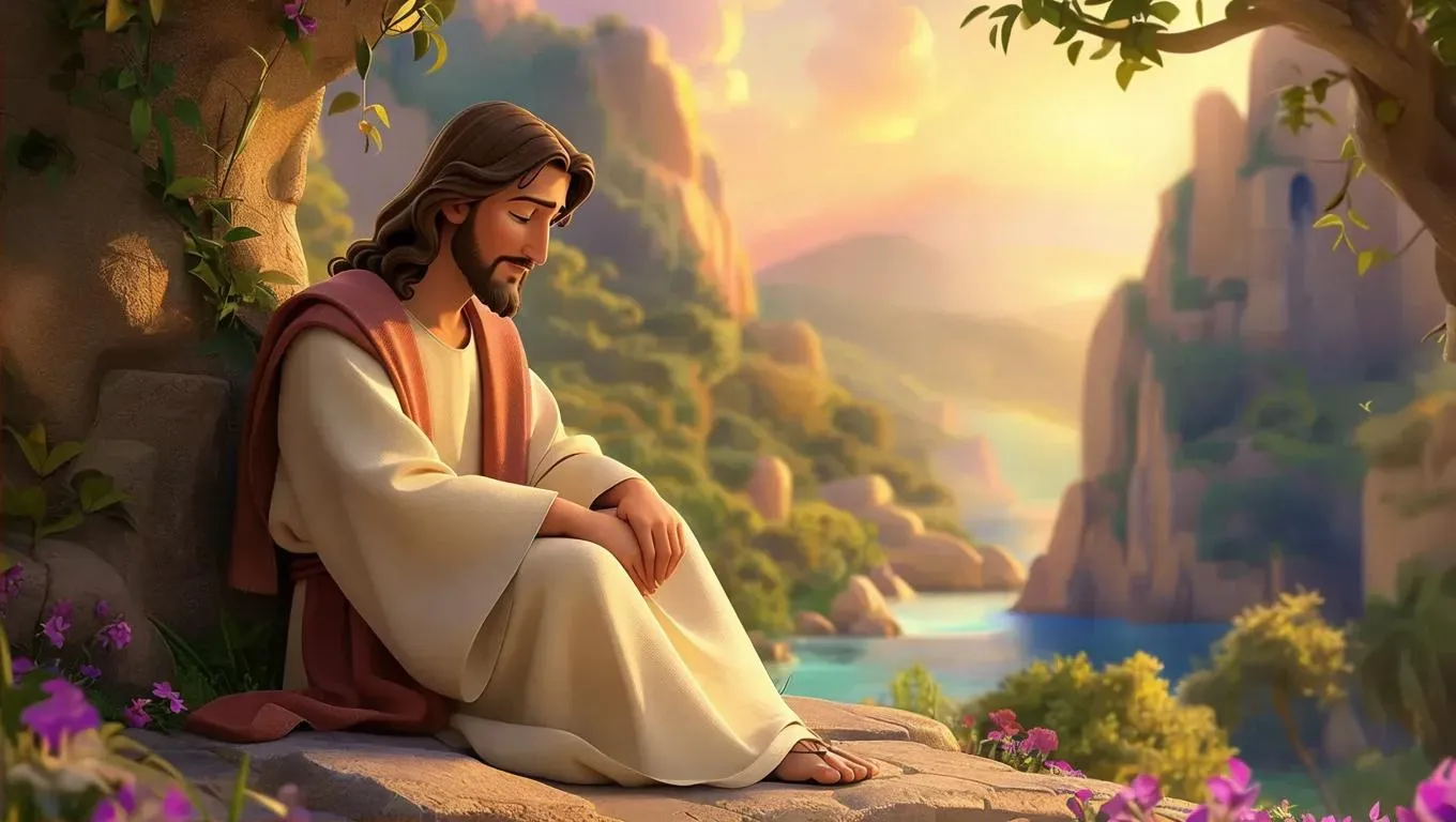 Generate a Disney-style AI image of Jesus sitting alone by a well. Experience spiritual serenity with vibrant colors, whimsical animation, and charming details, blending biblical scenes with playful Disney flair using Vivago.ai's AI art tools.