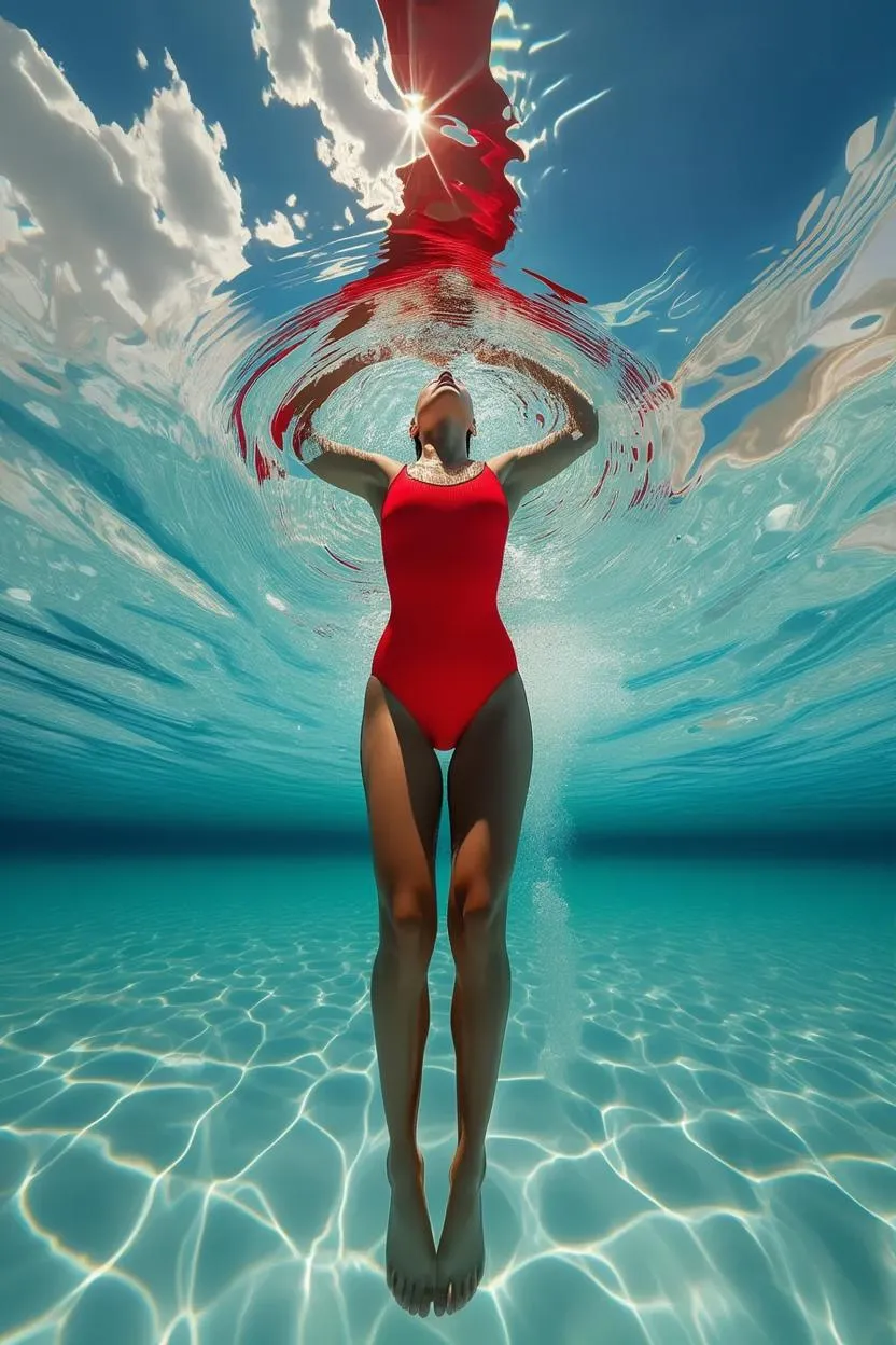 Generate stunning photorealistic images of a swimmer viewed underwater—vivid red swimsuit contrasts with crisp blue sky, water distortion adding dynamic realism. Ultra-HD resolution enhances texture mapping for lifelike details. Perfect AI-generated visuals for creative projects, ads, or artistic portfolios. Experience seamless AI image creation with VivaGo.ai’s advanced tools.