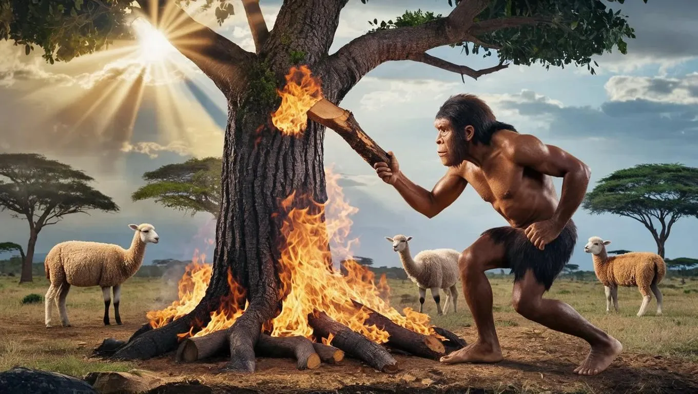 AI-generated video depicts a prehistoric discovery: lightning strikes a tree, igniting flames as Homo erectus cautiously claims fire. Create dramatic visuals of ancient human innovation with realistic lightning effects, fire animations, and primal storytelling elements through advanced AI tools for immersive historical scenes.