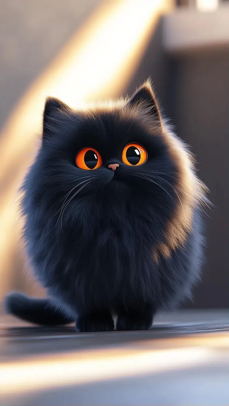 Craft a lifelike 3D animation of a fat black fluffy cat with vibrant orange eyes using Vivago.ai's AI image generator. Transform text prompts into professional-grade animations with advanced AI effects, vivid details, and realistic textures for creative visual content.
