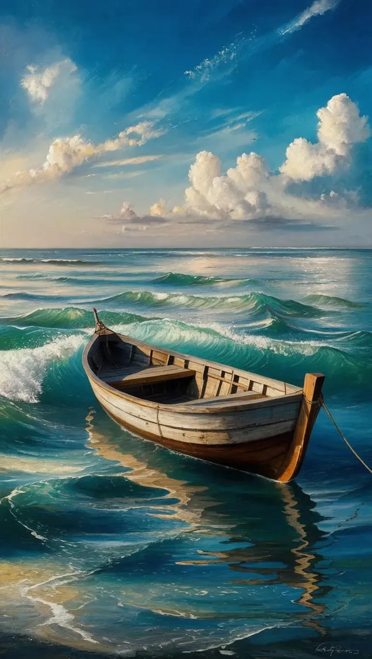 Experience a hyper-realistic ocean and sky scene with a serene small boat adrift, symbolizing tranquility and self-guided journeys. Vivago.ai's AI image generation and professional editing tools bring your vision to life. Create your own peaceful masterpiece with realistic details and hyperrealism effects.