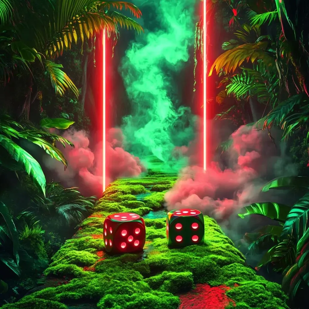 Transform your vision into AI-generated visuals with a vivid jungle scene blending green and red hues. Watch dice roll down a mystical pathway amid laser beams and smoky ambiance. Create dynamic, surreal imagery effortlessly using Vivago.ai's AI effects for striking, professional-grade art and videos.
